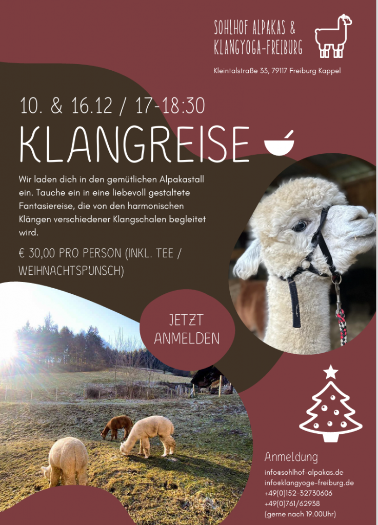 Noch 3 Plätze sind am 10.12. buchbar – Anmeldung bitte per E-Mail an info@sohlhof-alpakas.de oder Mobil 015232730606